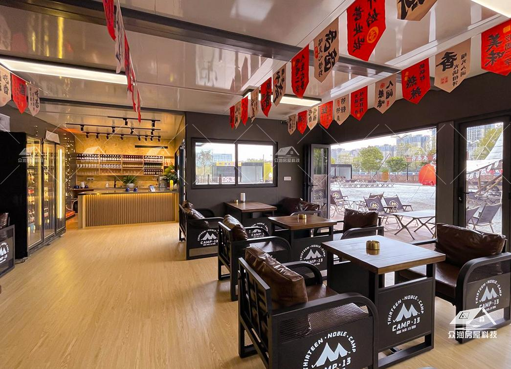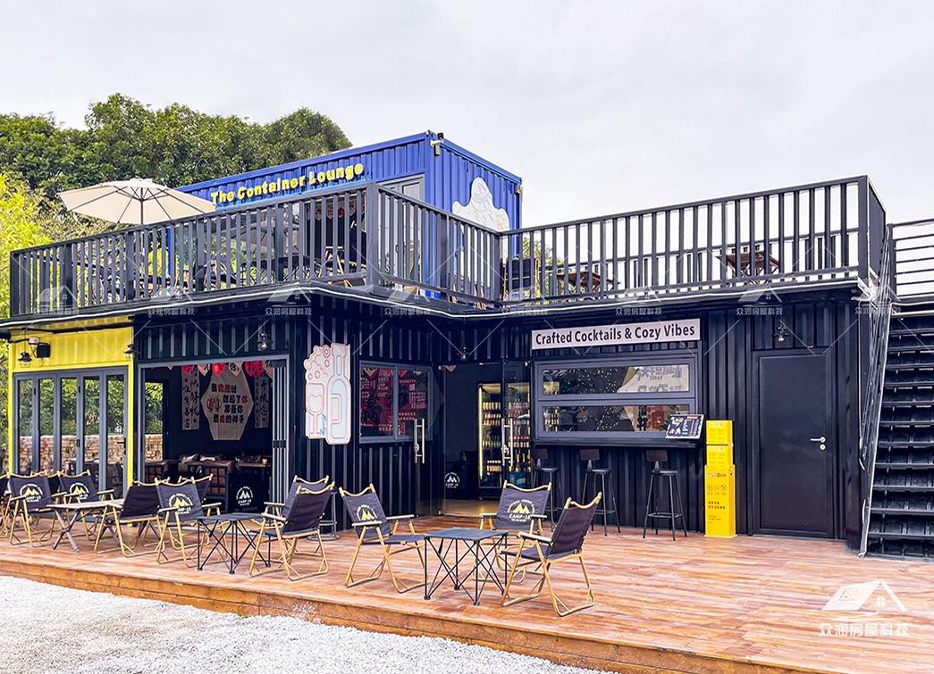 案例简介:集装箱搭建的清吧,仿佛天生就带着流量密码,独特的视觉冲击力是最大亮点。在满是玻璃幕墙和混凝土的城市里,带着工业风的集装箱清吧如同“异类”,粗犷的金属外壳、斑驳的锈迹(或个性化涂鸦),本身就是一道风景线,吸引人们前来一探究竟。下层做接待区,上层设观景露台,增加空间的趣味性。商铺集装箱搭建优势明显,结构稳定、造型多、成本低等,更多适合创业初期的老板,性价比更高。