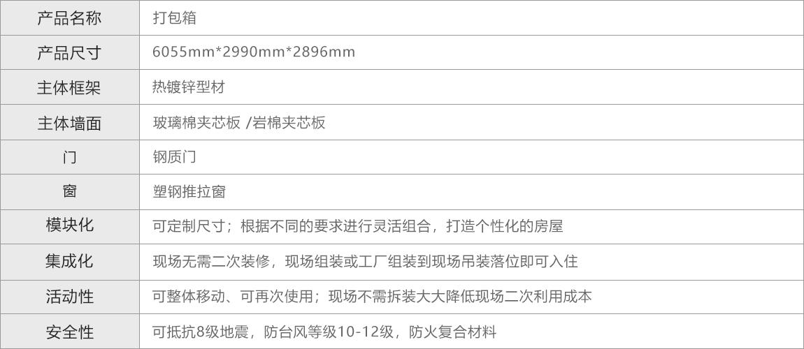 打包箱采用模数化设计,流水线生产,以箱体为基本单元,可单独使用,亦可任意拼装打造大空间、个性化房屋。主要特点是可散装,整体吊装,结构简单, 安全耐用,可再次使用。适用于临时居住、办公、仓储、会议室、商铺、私人会所、门禁箱、卫生间、淋浴箱、楼梯箱、可多功能使用。