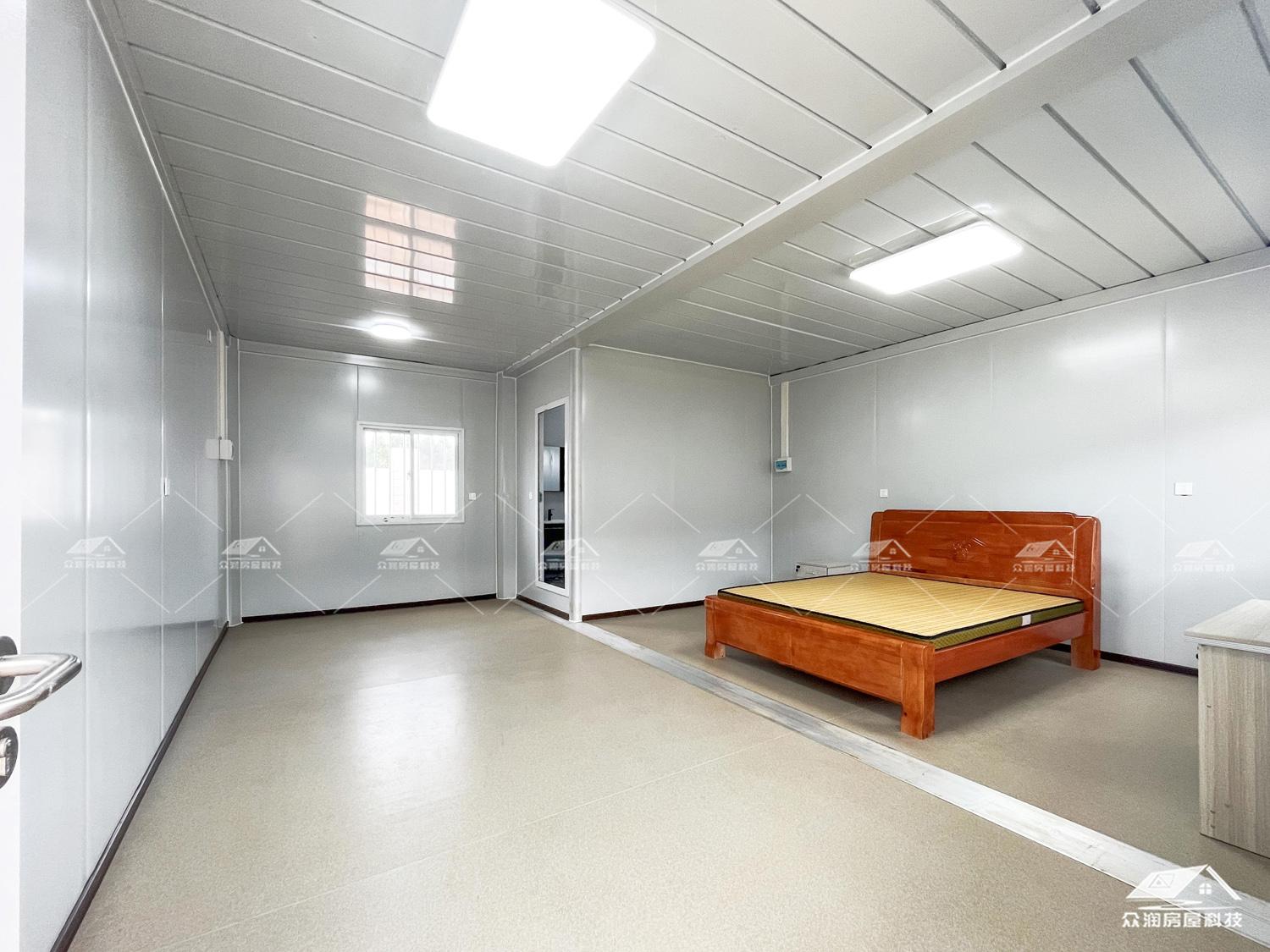 内部空间宽敞规整,可根据住宿需求合理布局,满足多人集中居住需求,环境整洁有序。全钢结构框架坚固稳定,抗震、抗风性能优异,居住安全可靠。墙体采用隐藏式排水设计,杜绝渗漏问题;内外墙板之间填充 5 公分厚玻璃棉毡,具备良好的保温隔热效果,有效改善室内居住舒适度,冬暖夏凉。