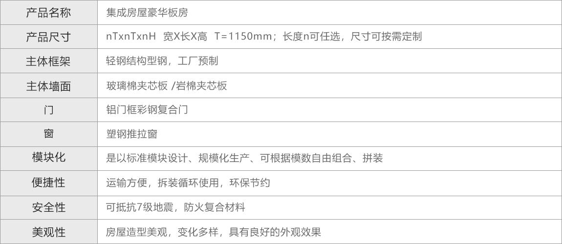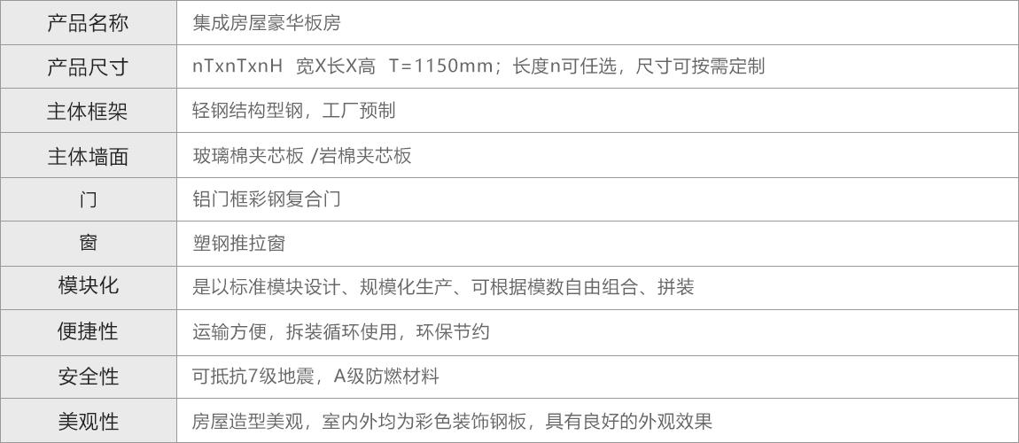 集成房屋-豪华板房是一种以轻钢为骨架,以夹芯板为围护材料,以标准模数系列进行空间组合,构件采用螺栓连接,全新概念的环保经济型房屋。 主要特点是结构可靠,造型美观,保温隔热,拆装便捷,布局灵活。适用于工地临时办公楼、会议室、学校、医院、指挥部、展览馆、停车场、加油站。