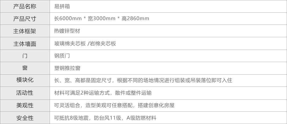 易拼箱是由框架和墙板组合而成的,不用焊接,完全采用螺丝固定。主要特点是可散装,整体吊装,拆装快捷,结构简单,运输方便。主要特点是稳定牢固,使用周期长,可再次使用 。适用于临时住房,办公室,会议室、仓库,工人宿舍,可多功能使用。