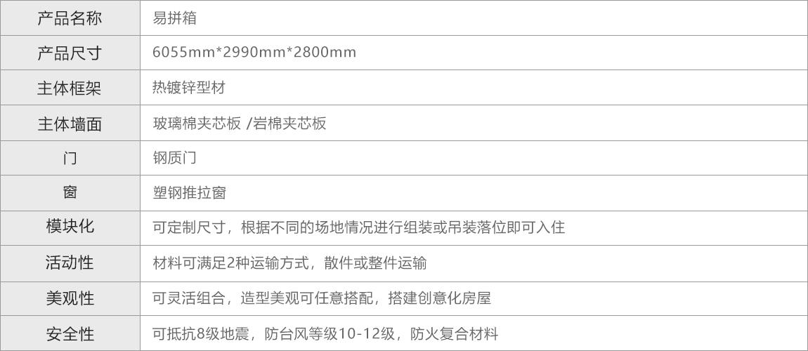 易拼箱是由框架和墙板组合而成的,不用焊接,完全采用螺栓固定。主要特点是可散装,也可整体吊装,拆装快捷,结构简单,运输方便。主要特点是稳定牢固,使用周期长,可再次使用 。适用于临时住房,办公室,会议室、仓库,工人宿舍,可多功能使用。