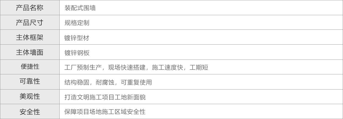 装配式围墙主要由围蔽面板、立柱、封边梁、斜撑、喷淋设备及灯光设备等部件组成。主要特点是结构稳固,拆装便捷,美观实用,可重复使用。适用于建筑工地、地铁工程,道路施工,活动场地、临时停车场、工业标准化厂房。