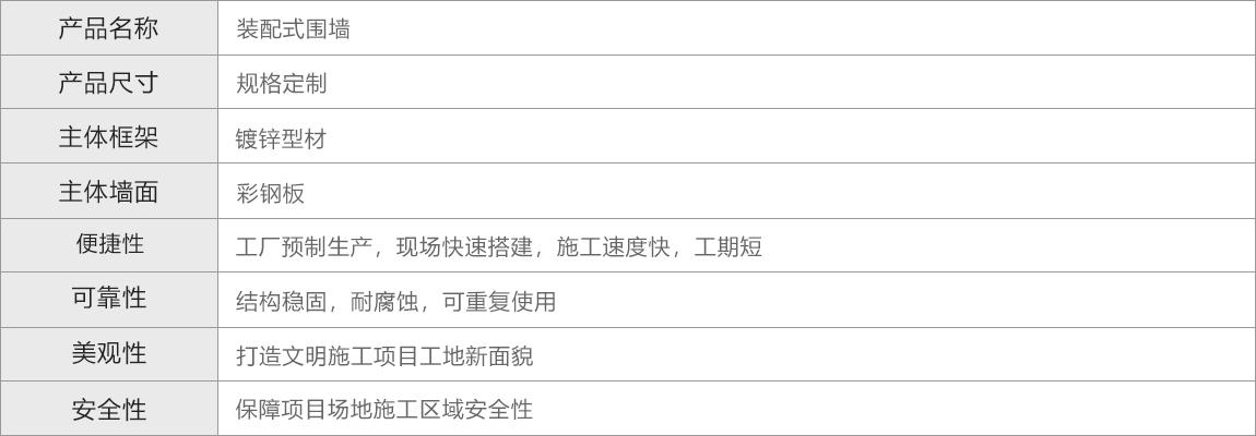 装配式围墙主要由围蔽面板、立柱、封边梁、斜撑、喷淋设备及灯光设备等部件组成。主要特点是结构稳固,拆装便捷,美观实用,可重复使用。适用于建筑工地、地铁工程,道路施工,活动场地、临时停车场、工业标准化厂房。