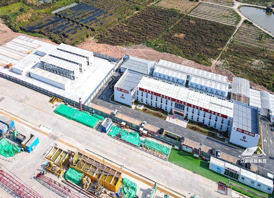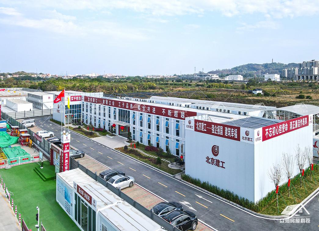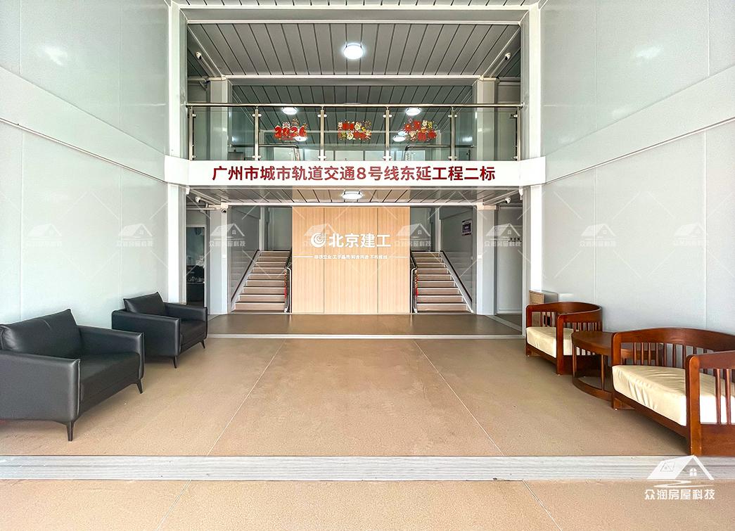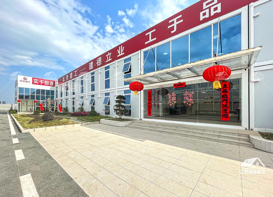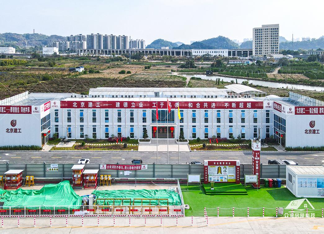 案例简介:广州市轨道交通8号线东延施工总承包项目部以打包箱房为主要载体,搭配福特蓝玻璃窗,整体外观更贴合现代建筑,看上去美观整洁。整个项目采用符合国家绿色建筑标准,防火岩棉夹芯板的环保材料。每个区域根据不同需求来分类,快速搭建出办公区、宿舍楼、会议室、资料室乃至厨房餐厅等独立功能单元。本次项目部落地周期能缩短50%以上,主要是依托工厂规模,大型模块化预制生产模式,预制率可达90%以上,使现场少数工人就能快速安装,真正实现“即到即装、即装即用”。这次项目的模块化建筑不仅是技术革新,更是建筑理念的进化。它以高效、环保、灵活的特点,为现代工程建设提供了全新的解决方案,在提升项目效率的同时,也为建筑行业可持续发展做出了积极贡献。